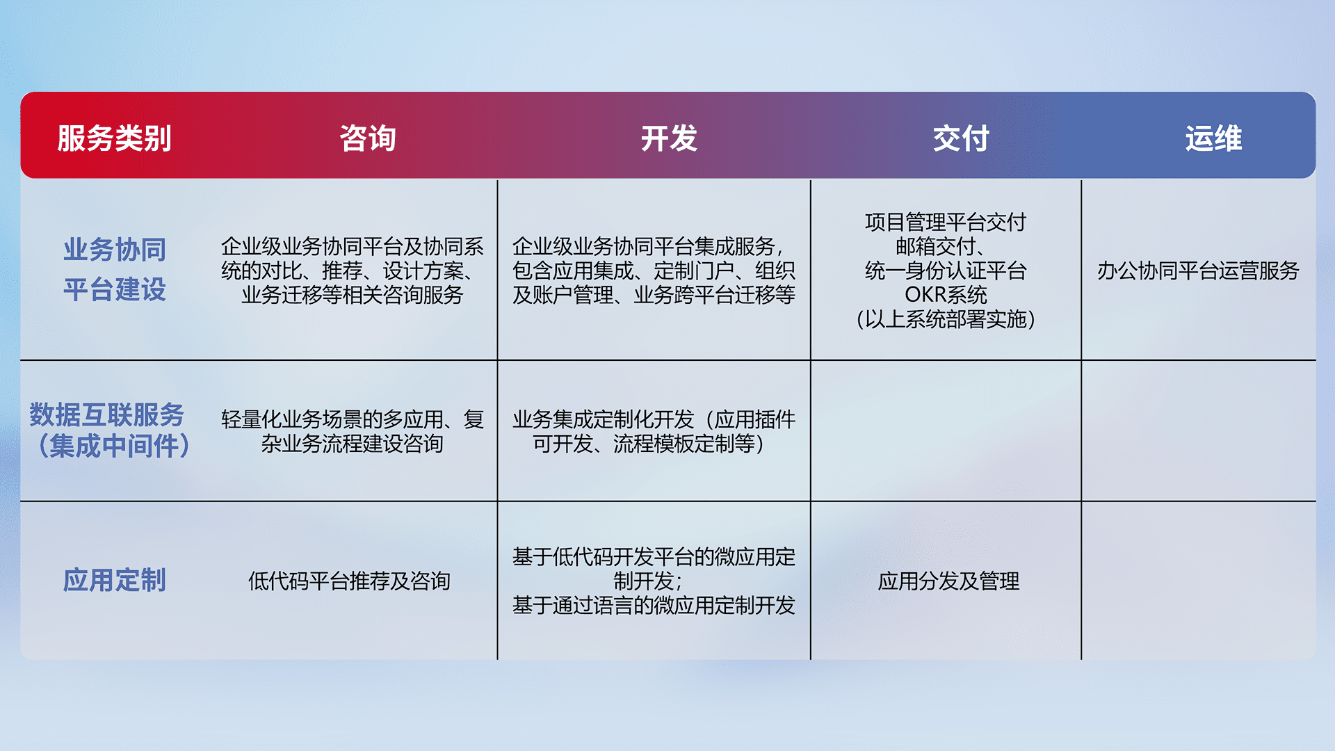 针对钉钉、、、、企微、、IDaas等平台级产品提供产品的规划、、、方案、、交付、、、、定制化开发等服务,,,实现如统一协同办公、、、智能客户服务、、混合会议管理、、、、智能数据查询、、、等业务场景,,实现数字化转型。。。。