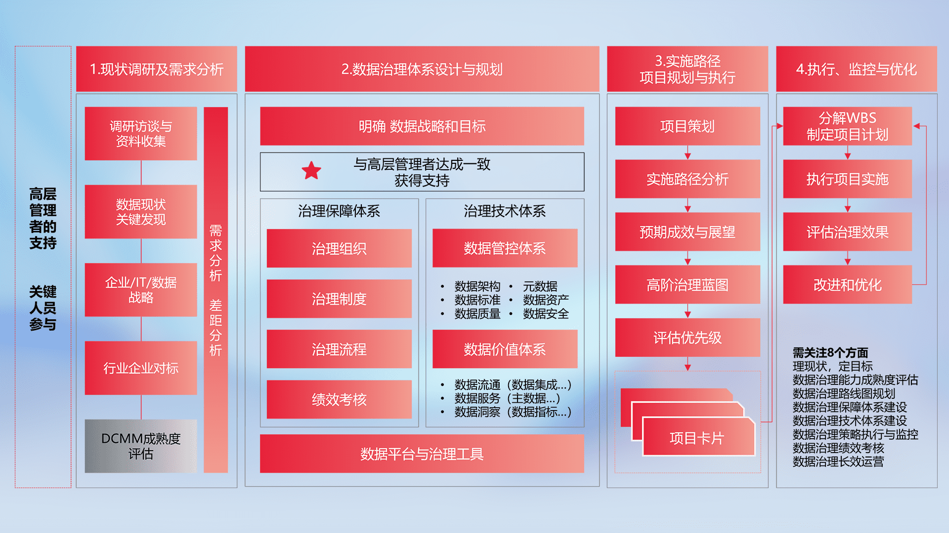 制定并执行统一的数据标准,,,,规范数据定义和格式,,,消除冗余和不一致性,,,实现跨部门和跨系统的数据一致性,,,,为企业提供标准化的数据基础。。